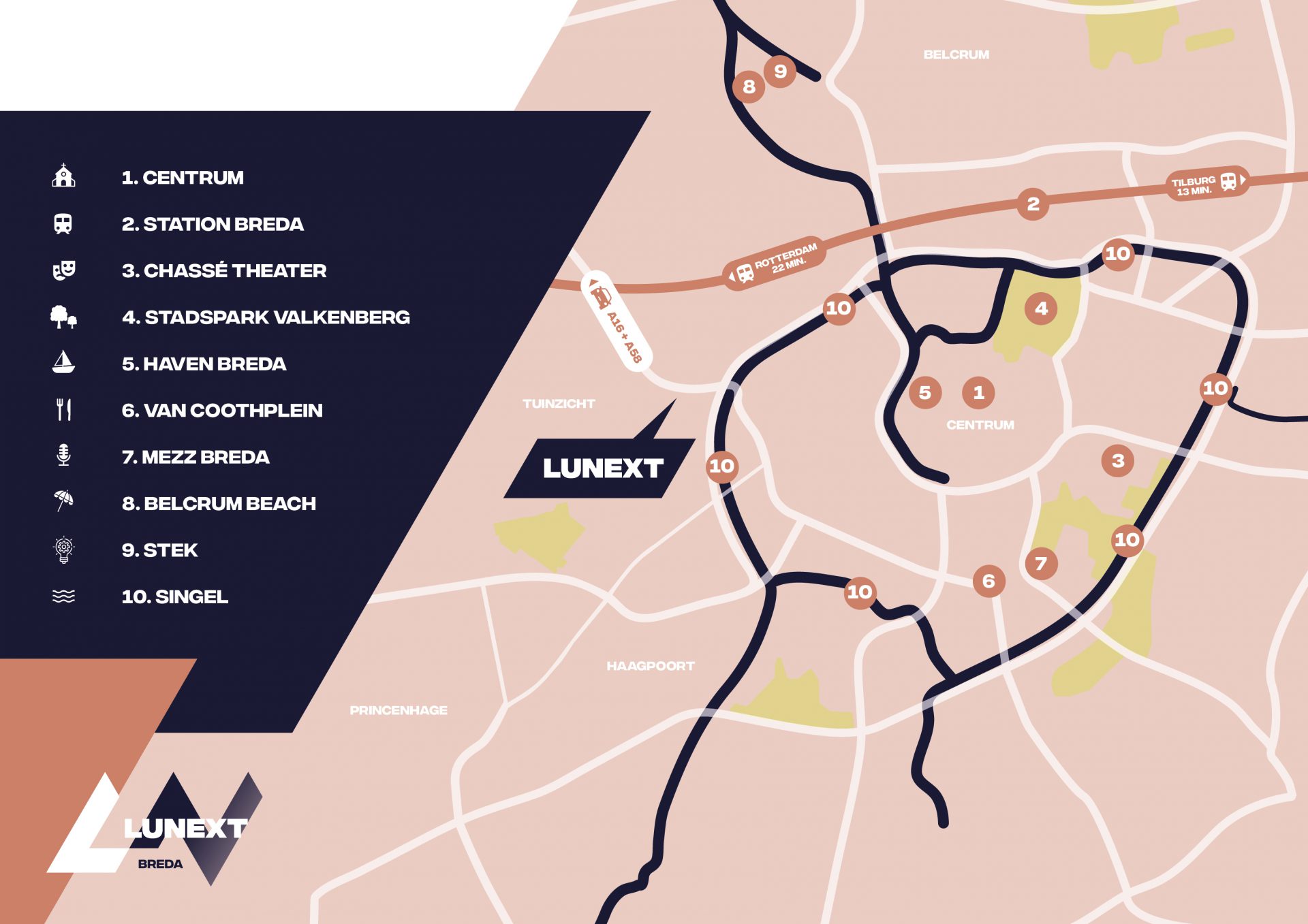 Bij een locatie zo dicht bij het centrum kun je je afvragen hoe goed bereikbaar de woningen zijn. Bij LUNEXT is het antwoord: zeer goed! Het stadscentrum is slechts 5 minuutjes fietsen! Daarnaast is het direct gelegen aan een van de belangrijkste OV-verbindingen van Breda. Hierdoor ben je met de bus binnen 15 minuten op het station. Vanaf daar reis je eenvoudig in 23 min. naar Rotterdam, in 1:23 uur naar Amsterdam en in 34 min. naar Antwerpen. Naar de Brabantse steden Tilburg, ‘s-Hertogenbosch en Eindhoven doe je er maximaal 38 min. over! Liever met de auto? Dankzij de goede verbinding met de A16 en A58 sta je in 45 minuten in Rotterdam, binnen 30 minuten in Tilburg en binnen 50 minuten in Antwerpen.